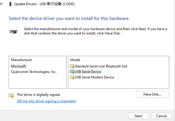Just simplity select Microsoft/USB Serial Device on Driver Selectors wizerd